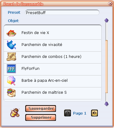 Un double-clic permet de retirer un consommable de la liste, et le bouton "Supprimer" permet d'effacer complètement la page de preset.